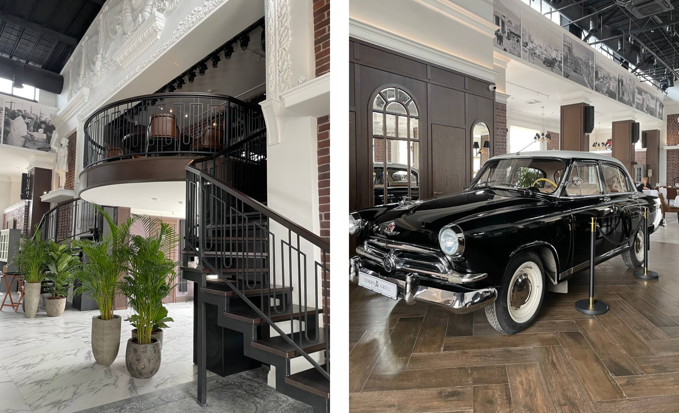 Первое, что поражает, — масштаб и торжественность. Огромный зал, белоснежные скатерти, которые, как мы заметили, меняют после каждого гостя, и выверенный до мелочей интерьер — сразу видно: здесь не экономят на деталях.