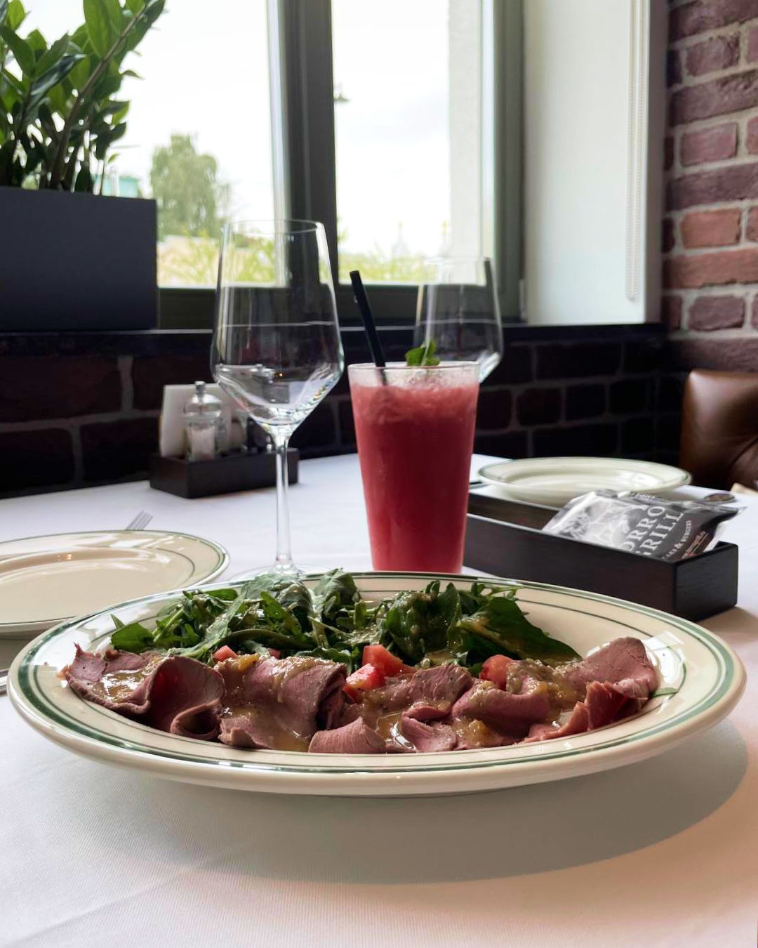 Если «Цезарь» был хорош, то салат с ростбифом и томатами [650₽] — это просто восторг. Ростбиф таял во рту, а заправка с кунжутной ноткой сделала вкус по-настоящему глубоким и интересным. Серьёзно: пока это самый вкусный соус в жизни нашего независимого корреспондента.